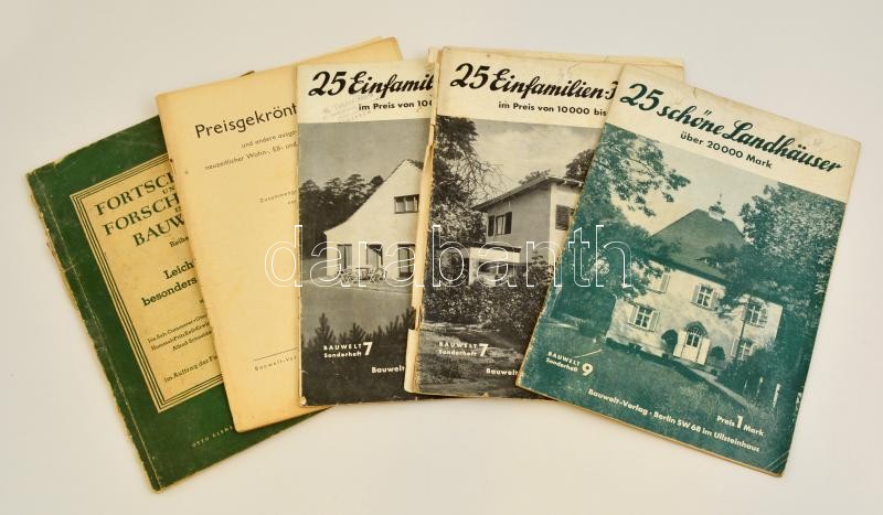 cca 1930-1940 Vegyes német nyelvű építészettel kapcsolatos nyomtatványok, 6 db: 1933-1937 Neunzeitliches Bauwesen Heraklith-Rundschau. 1933. 5. évf. 2.sz.,1937. 9. évf. 6. sz. 25 Einfamilien-Häuser im Preis von 10000 bis 20000 Mark. Berlin, Bauwelt-Verlag. 25 Schöne Landhäuser Im Preise über 20000 Mark. Berlin, Bauwelt-Verlag. 25 Einfamilien-Häuser im Preis von 10000 bis 20000 Mark. Berlin, Bauwelt-Verlag. 6. kiadás. 1937 Preisgekrönte Zimmer und andere ausgewählte Beispiele neunzeitlicher Wohn-, Eß- und Schalfzimmer-Einrichtungen. Berlin, Bauwelt-Verlag. 1943 Fortschritte und Forschungen in Bauwesen Reihe B. Heft 2. Leichtbaustoffe besonders für Mauerwerk. Berlin, Otto Elsner Verlagsgesellschaft, 80 p. Papírkötés, a hátsó borítója hiányzik. Változó, többnyire kissé foltos, kissé szakadozott állapotban.