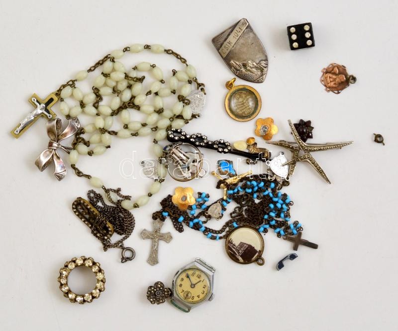 Beschreibung: Különböző apróságok, ékszerek, bizsuk gyűjteménye, benne ezüst is.