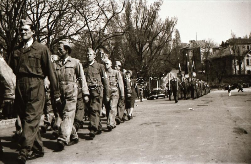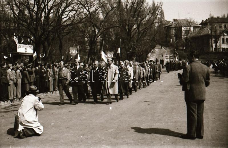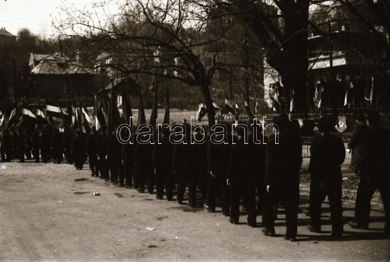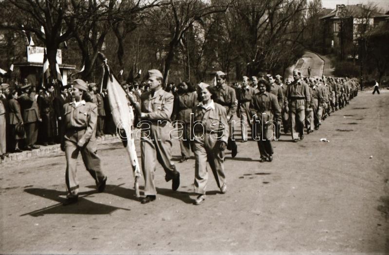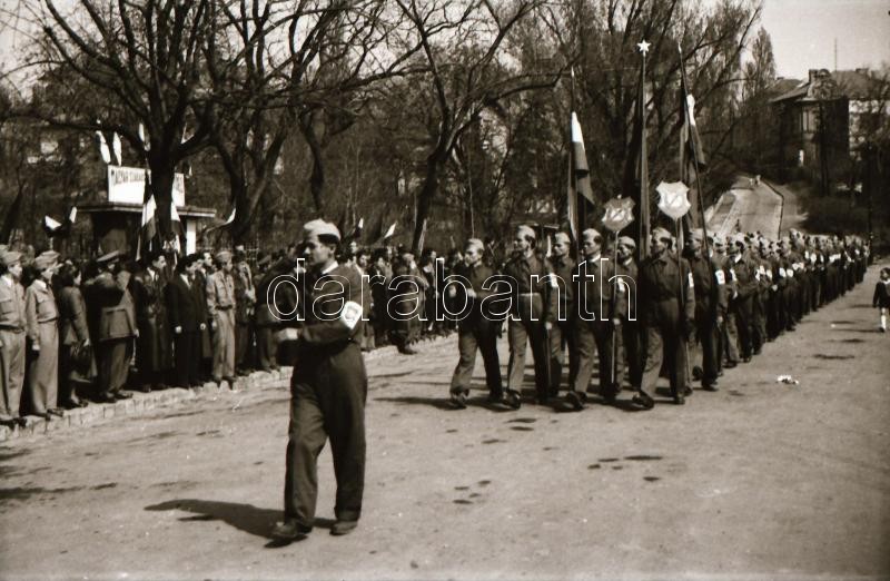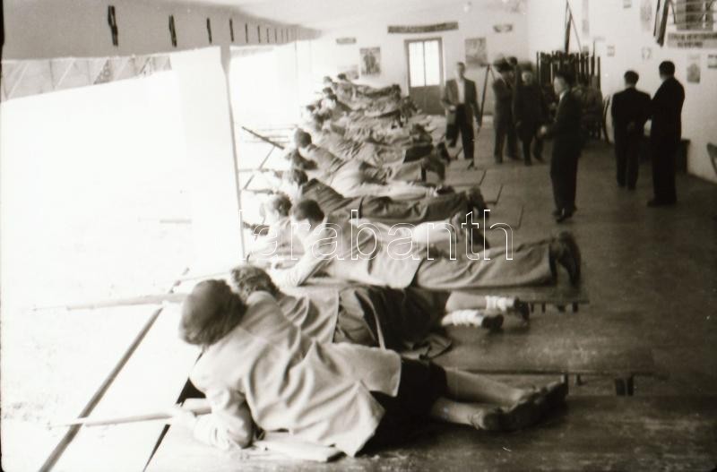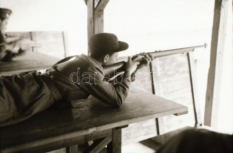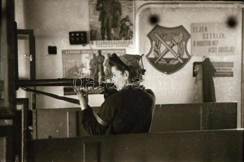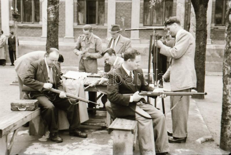 1949. április 1. Budapest, felszabadulási lövészverseny, a csapatok felvonulása, lőtér, fegyverek, stb..., 55 db szabadon felhasználható vintage negatív, 24x36 mm