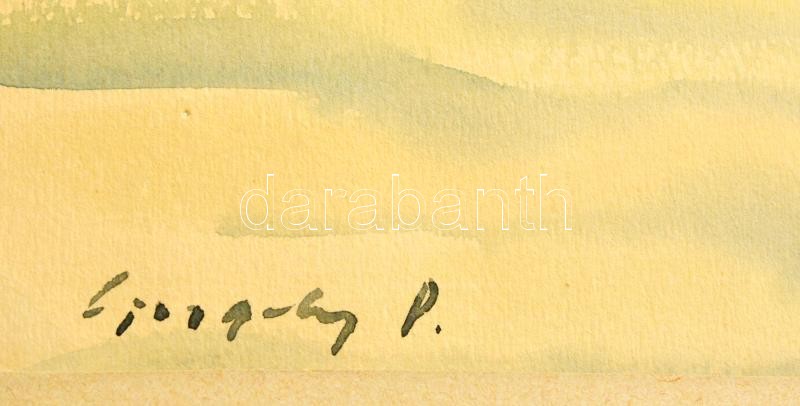 Beschreibung: Olvashatatlan jelzéssel: Hajnal a Balatonon. Akvarell, papír, jelzett, 21×33 cm