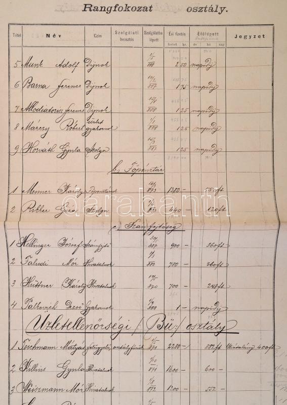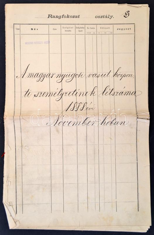 1888 A Magyar Nyugoti Vasút központi személyzetének létszáma 1888 évi november hóban. Nevekkel, beosztásokkal, fizetésekkel, belépési dátumokkal, szakadozott, pecsétekkel.