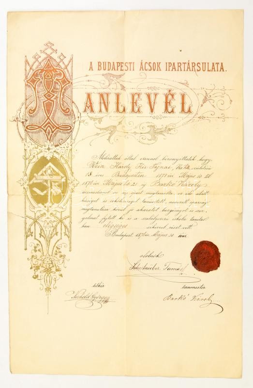 Beschreibung: 1876 a Budapesti Ácsok Ipartestülete díszes tanlevele ácstanonc részére, kis sérüléssel, viaszpecséttel