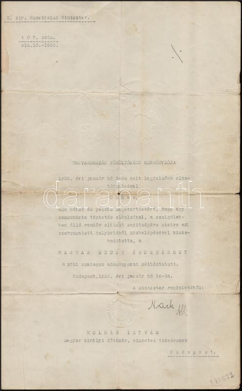 1933 Magyar Ezüst Érdemérem (zöld szalagon) adományozó oklevél Molnár István főtüzér, címzetes tizedes részére, szolgálatban lévő rendőr kommunista tüntetésen való megsegítéséért
