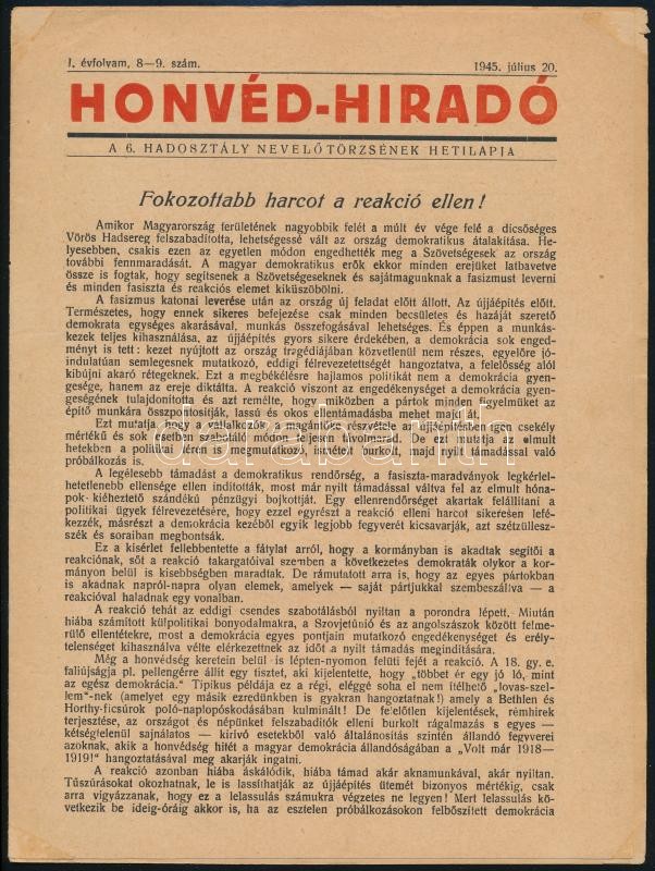 1945 Honvéd-híradó, a 6. hadosztály nevelőtörzsének hetilapja, I. évf.... https://www.darabanth.com/de/318-Fernauktion/318.0/Andere-Sammelgebiete/Militaria~27/1945-Honved-hirado-a-6-hadosztaly-nevelotorzsenek-hetilapja-I-evf-8-9-sz-1945-juliu~II1757004