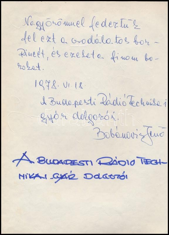 Beschreibung: 1961-1978 Bessenyei Ferenc színművész ls Erőss Anna rádióbemondó sajátkezű írása és aláírása emléklapon + fotó Bessenyei Ferencről borkóstolás közben