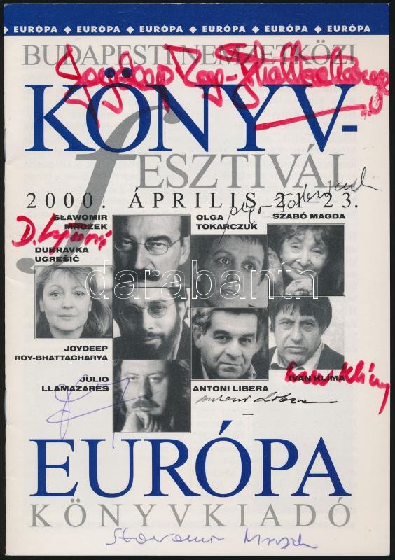 2000 Sławomir Mrożek (1930-2013), Joydeep Roy-Bhattacharya, Ivan Klíma (1931-), Antoni Libera (1949-), OlgaTokarczuk (1962-), Dubravka Ugresic (1949-) írók és Julio Llamazares (1955-) költő saját kezű aláírásai a Budapesti Nemzetközi Könyvfesztivál prospektusán.