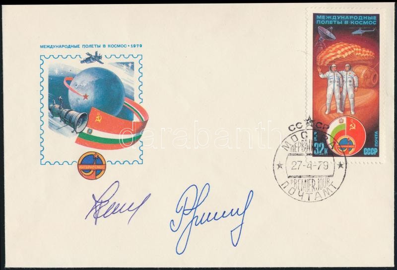 Nyikolaj Rukavisnyikov (1932-2002) szovjet és Georgij Ivanov (1940- ) bolgár űrhajósok aláírásai emlékborítékon / Signatures of Nikolay Rukavishnikov (1932-2002) Soviet and Georgiy Ivanov (1940- ) Bulgarian astronauts on envelope