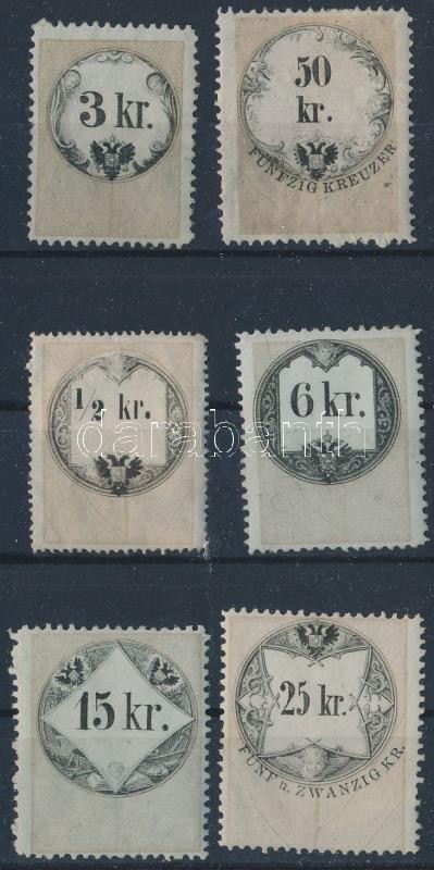 6 db használatlan okmánybélyeg https://www.darabanth.com/de/318-Fernauktion/318.0/Andere-Sammelgebiete/Stempelmarken~15/6-db-hasznalatlan-okmanybelyeg~II1758075