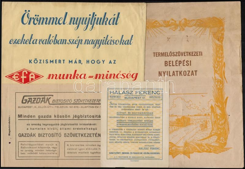 Beschreibung: 8 db reklámkiadvány és levelezőlap (EFA, Halász Ferenc posztókereskedő, Termelőszövetkezeti belépési nyilatkozat, Gazdák Biztosító Szövetkezete + 4 levelezőlap)