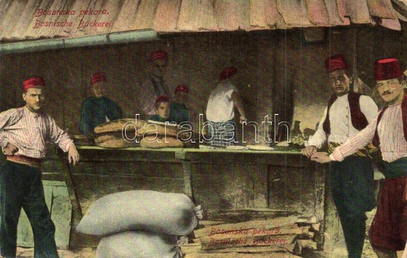 Beschreibung: Bosanska pekara / Bosnische Bäckerei / Bosnian bakery, folklore, traditional costume. W. L. Bp. 1910. No. 9. (szakadás / tear)
