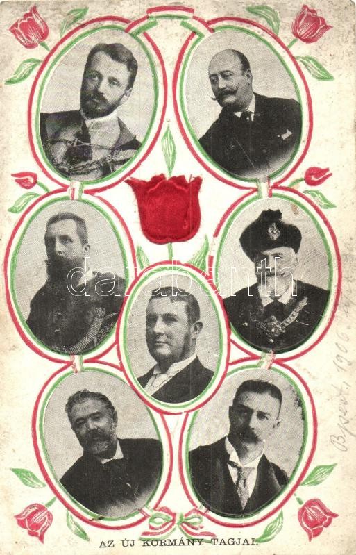 1906 A második Wekerle-kormány tagjai: Wekerle Sándor, Ifj. Andrássy Gyula, Polónyi Géza, Kossuth Ferenc, Apponyi Albert, Josipovich Géza, Zichy Aladár. tulipános, hazafias dombornyomott minta / Hungarian Goverment of 1906. Emb. folklore, patriotic tulips (EM)