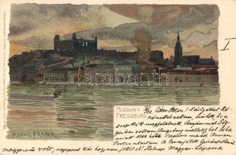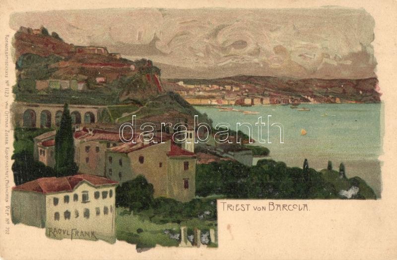 12 db régi Raoul Frank litho városképes művészlap jó állapotban: Pozsony, Trieszt, Zágráb, Fiume, Pola / 12 pre-1945 litho town-view art postcards with Raoul Frank signatures in good condition: Bratislava, Trieste, Zagreb, Fiume, Pola. Ottmar Zieher Kunstanstalt Künstlerpostkarte