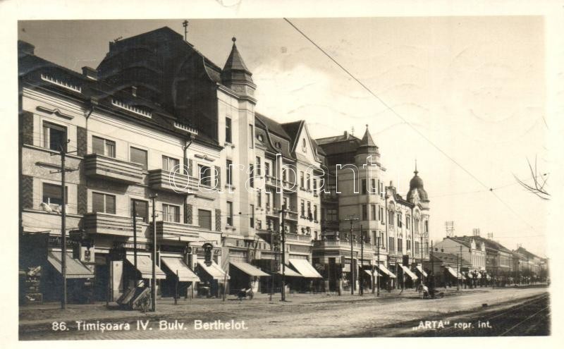 1937 Temesvár, Timisoara; Józsefváros, Berthelot sugárút, illatszertár, Ariadne, F. Österreicher, F. Pollák, Löffler és fia és Székely üzlete, Temesvári Bank és kereskedelmi rt. fiókja / IV. Bulv. Berthelot / street view with shops, perfumery, bank. Arta repr. int.