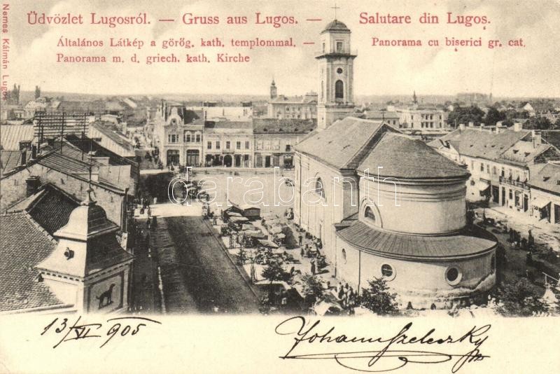 Lugos, Lugoj; Görögkatolikus templom, piac, üzletek. Nemes Kálmán kiadása / Biserici gr. cat. / Griech kath. Kirche / Greek Catholic church, market, vendors, shops (EK)