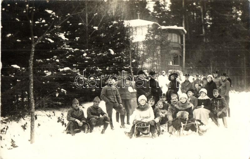 1917 Tátra, szánkózó katonák és hölgyek csoportképe télen / sledding K... https://www.darabanth.com/de/318-Fernauktion/318.0/Ansichtskarten/Slowakei~2500011/1917-Tatra-szankozo-katonak-es-holgyek-csoportkepe-telen-sledding-KuK-soldiers-and-la~II1757279