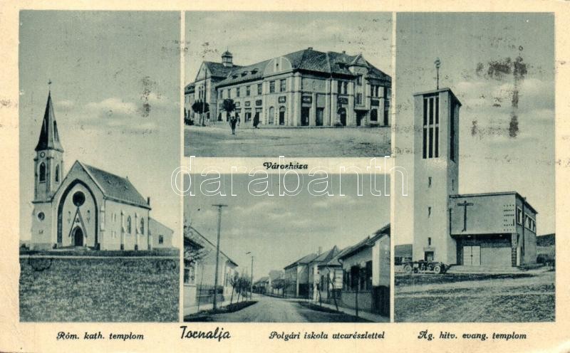 Beschreibung: Tornalja, Tornala; városháza, római katolikus és ágostai hitvallású evangélikus templom, polgári iskola, utca / town hall, churches, school, street (EK)