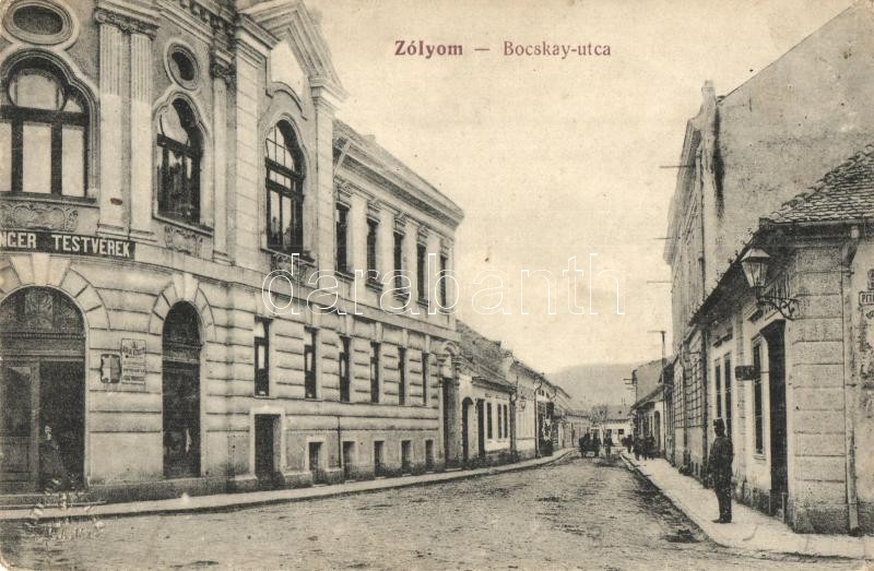 Beschreibung: Zólyom, Zvolen; Bocskay utca, üzletek / street view, shops (kopott sarkak / worn corners)