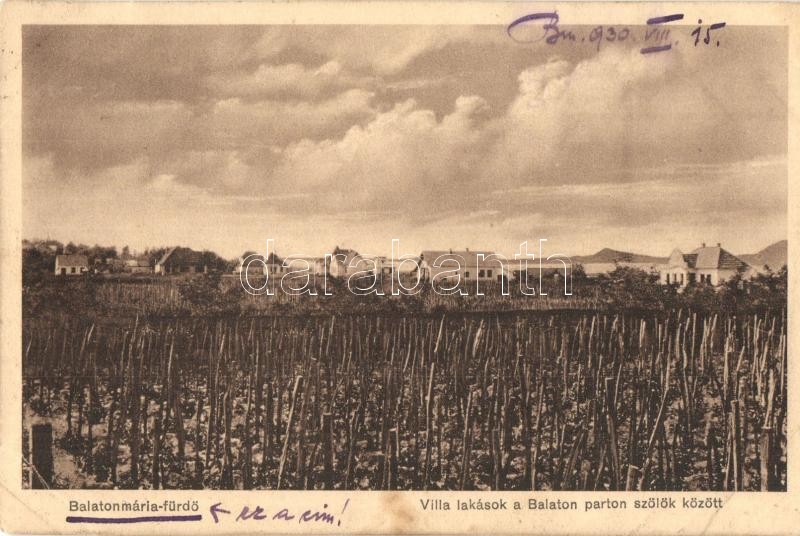 Beschreibung: Balatonmáriafürdő, Villa lakások a Balaton parton szőlők között. Gyenes Lajos kiadása (EK)