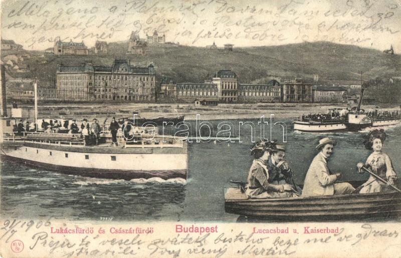 Beschreibung: Budapest II. Szent Lukács és Császár fürdő, gőzhajó és csónakázók montázs (EK)