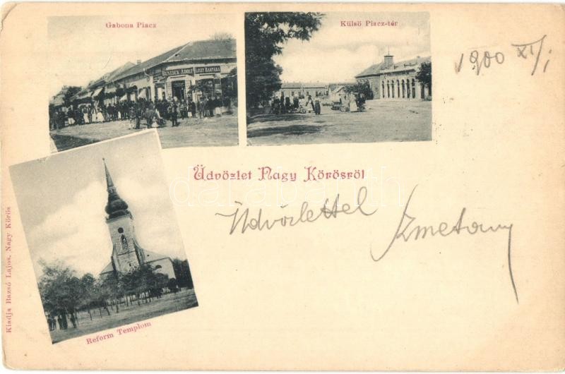Beschreibung: Nagykőrös, Gabona piac, Külső Piac tér, Református templom. Benedek Adolf Liszt raktárának üzlete. Bazsó Lajos kiadása (EK)