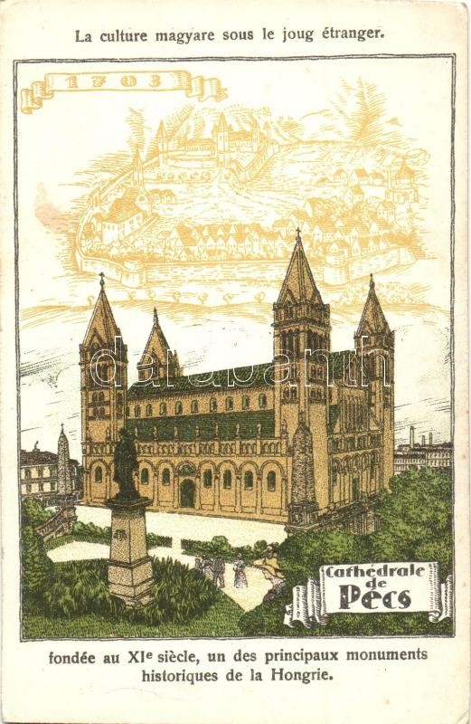 Beschreibung: Pécs, La culture magyare sous le joug étranger, Cathédrale / Székesegyház anno 1703. Francia kiadású képeslap (EK)