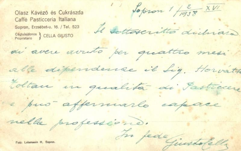 Sopron, Olasz Kávézó és Cukrászda, belső. Erzsébet utca 16. Cella Gius... https://www.darabanth.com/de/318-Fernauktion/318.0/Ansichtskarten/Ungarn~2500013/Sopron-Olasz-Kavezo-es-Cukraszda-belso-Erzsebet-utca-16-Cella-Giusto-cegtulajdonos-level~II1754892