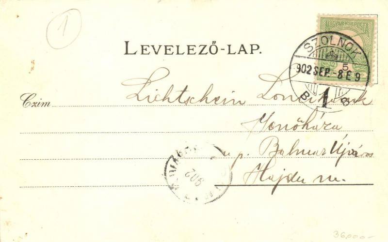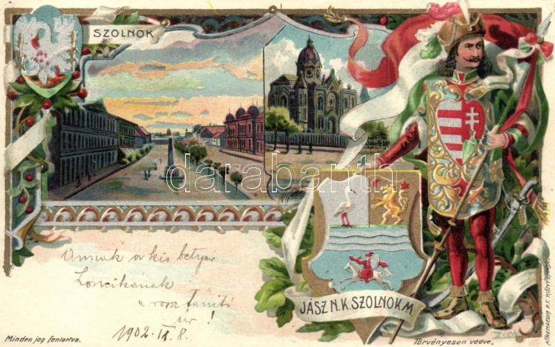 Beschreibung: Szolnok, Jász-Nagykun-Szolnok vármegye címer, Zsinagóga, Fő tér. Athenaeum Rt. kőnyomdája. Art Nouveau, floral, litho. s: Zich (EK)