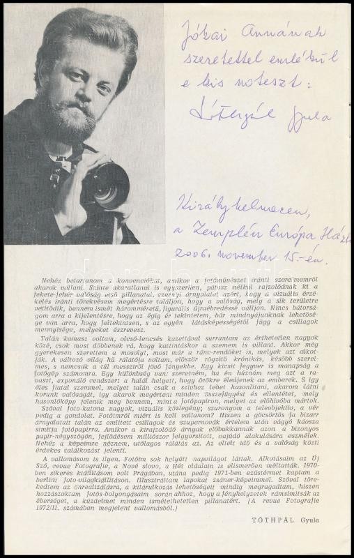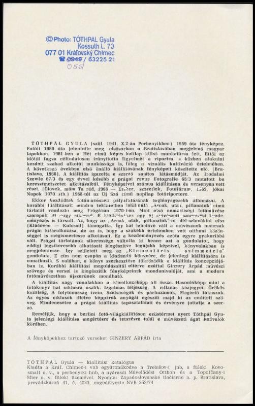 Tóthpál Gyula: Elementáris Szimmetria. Tóthpál Gyula (1941-2015) fotóművész kiállítási katalógusa. Bratislava, é.n., Západoslevenské tlaciarne n. p. Kiadói papírkötés. A fotóművész által Jókai Anna (1932-2017) írónőnek dedikált példány.