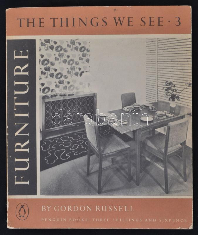 Gordon Russell: Furniture. The things we see 3. Harmondsworth, 1953, Penguin Books. Második, javított kiadás. Kiadói papírkötés, kissé kopottas borítóval, fekete-fehér fotókkal, angol nyelven./ Paperbinding, in English language.