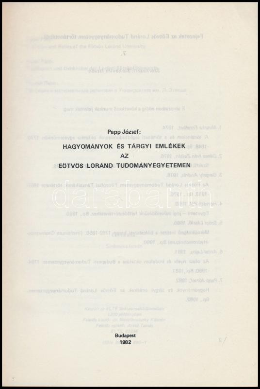 Papp József: Hagyományok és tárgyi emlékek az Eötvös Loránd Tudományegyetemen. Bp., 1982, ELTE. Kiadói papírkötés, megjelent 1200 példányban, benne az alapító okirat facsimile kiadásával, jó állapotban.