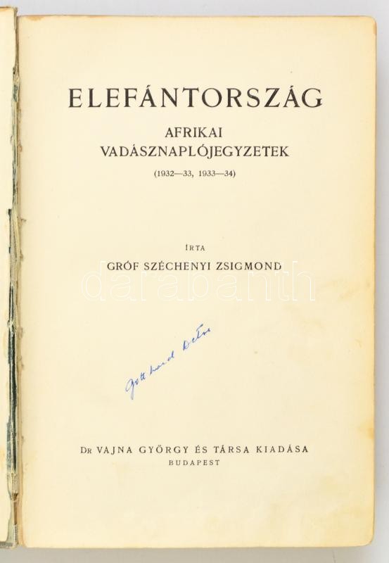 Széchényi Zsigmond: Elefántország. Afrikai vadásznaplójegyzetek. (1932-1933,1933-1934.) Bp.,(1934), Dr. Vajna György és Bokor, (Athenaeum-ny.),260+12 p.+1 térkép. Egészoldalas fekete-fehér fotókkal. Első kiadás. Kiadói egészvászon-kötés, rossz állapotban, kopott borítóval, sérült gerinccel, kissé laza fűzéssel, foltos lapszélekkel,az elülső szennylap és előzéklap, a hátsó szennylap és tartalomjegyzék kijár, 253/254. oldal szakadt.