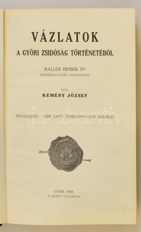 Kemény József: Vázlatok a győri zsidóság történetéből. Győr, 1930, Sze... https://www.darabanth.com/de/318-Fernauktion/318.0/Bucher/Bucher-Judaica~1500012/Kemeny-Jozsef-Vazlatok-a-gyori-zsidosag-tortenetebol-Gyor-1930-Szerzo-Egeszvaszon~II1757457