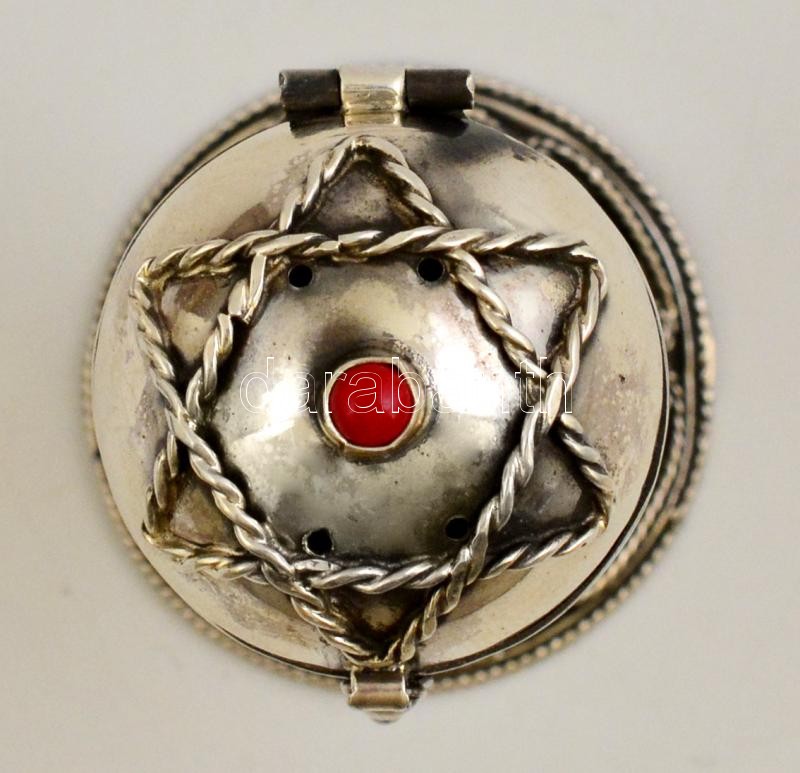 Ezüst(Ag) psumintartó, Dávid-csillaggal, kő berakással, jelzett, m: 7... https://www.darabanth.com/de/318-Fernauktion/318.0/Juwelen/Juwelen~1500017/EzustAg-psumintarto-David-csillaggal-ko-berakassal--jelzett-m-7-5-cm-brutto-45-3-g~II1726034
