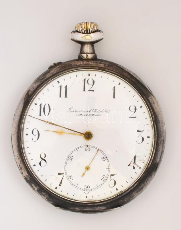 cca 1900 Ezüst (AG) IWC Schaffhausen zsebóra, másodperc mutatóval, széria számmal, jelzett, működő állapotban, sérült számlappal, bruttó: 85 g./ cca 1910 Vintage Silver (AG) IWC Schaffhausen pocket watch, with secondhand, with serial number, signed, works, with damaged clockface, gross weight:: 85 g.