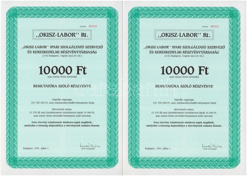 Budapest 1991. "OKISZ-LABOR Ipari Szolgáltató Szervező és Kereskedelmi Részvénytársaság" 10.000Ft értékű bemutatóra szóló részvénye (2x) sorszámkövetők, szelvényekkel T:I-