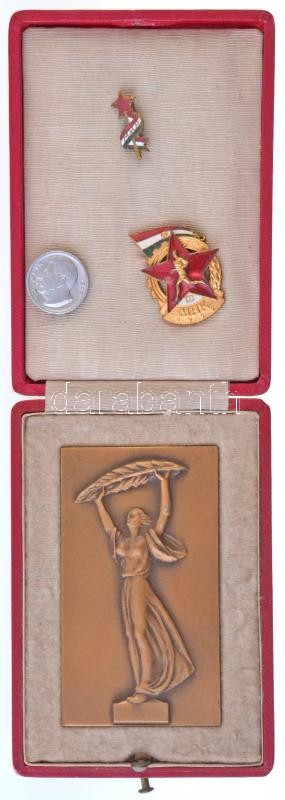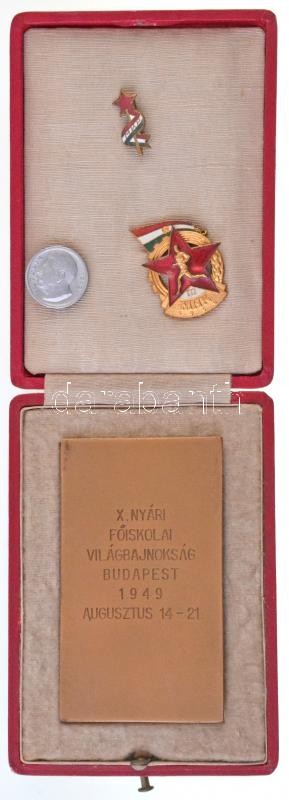 1949. "X. Nyári Főiskolai Világbajnokság Budapest 1949. Augusztus 14-21." Br emlékplakett eredeti dísztokban, a tokban még "Sztálin 1949" fém kitűző, "MKP" zománcozott fém kitűző és "MHK" zománcozott fém jelvény (46x80mm) T:1-