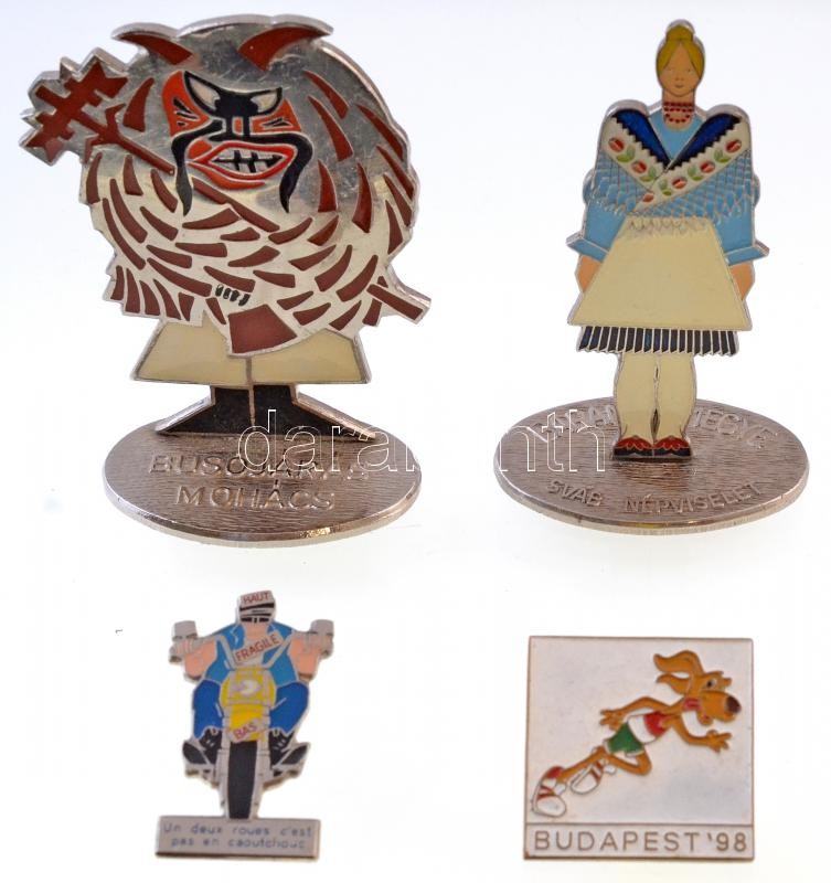 Vegyes 4db-os tétel benne két kitűző, közte "Budapest 98" zománcozott sport témájú, valamint zománcozott figurák "Busójárás Mohács" és "Baranya megye - Sváb népviselet" T:1-