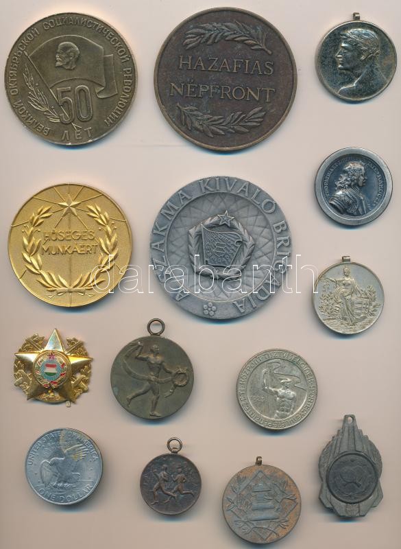 Beschreibung: 57db magyar és külföldi kitüntetés, jelvény, sportérem, emlékérem, fémpénz, közte sok szocialista darab T:vegyes