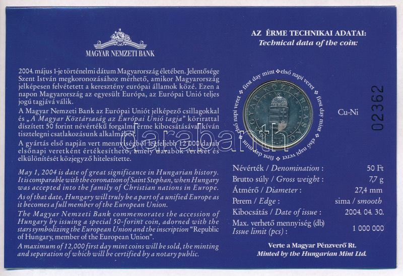 2004. 50Ft Cu-Ni "Magyar Köztársaság az Európai Unió tagja" ... https://www.darabanth.com/de/318-Fernauktion/318.0/Numismatik/Ungarische-Munzen-und-Munzen-mit-ungarischem-Munzzeichen~1000007/2004-50Ft-Cu-Ni-Magyar-Koztarsasag-az-Europai-Unio-tagja-elso-napi-veret-sorszamozott-emlC3~II1738158