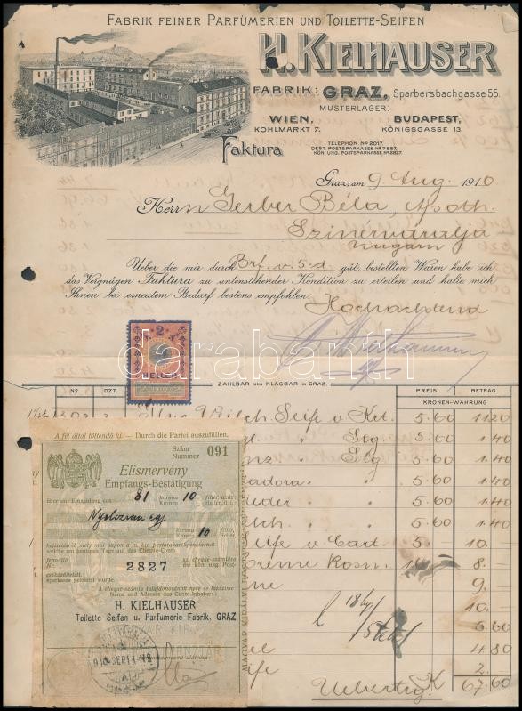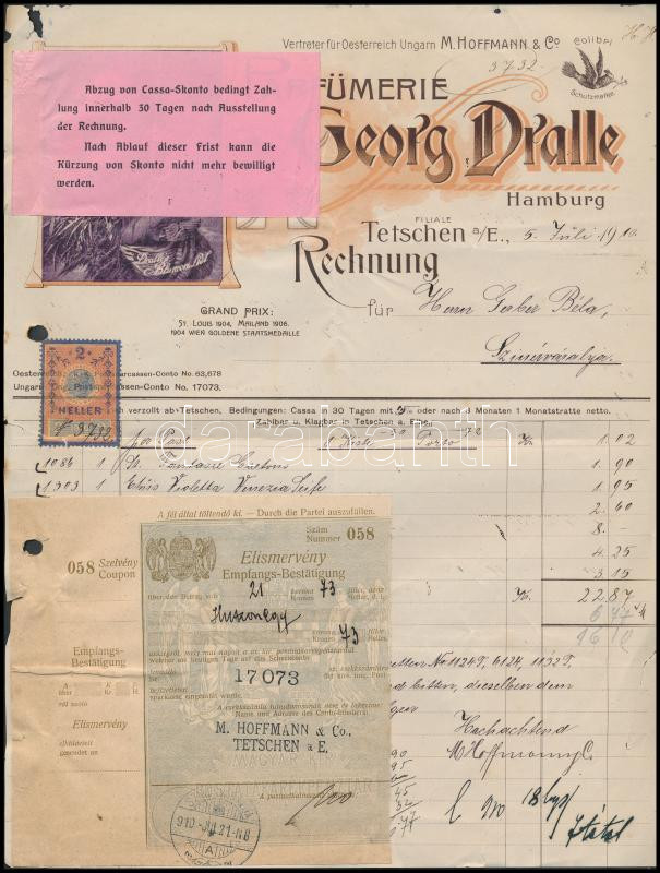 1910 2 db díszes fejléces számla (Georg Dralle és H. Kielhauser kozmetikai termékei) 2h okmánybélyeggel, hajtva / antique invoices for cosmetic products, with document stamp