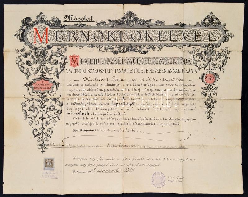 1913 M. Kir. József-Műegyetem mérnöki oklevelének másolata, pecséttel,... https://www.darabanth.com/de/319-Fernauktion/319.0/Andere-Sammelgebiete/Dokument~17/1913-M-Kir-Jozsef-Muegyetem-mernoki-oklevelenek-masolata-pecsettel-3-k-okmanybelyeggel~II1759938
