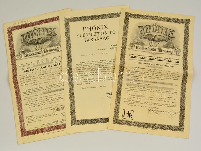 Beschreibung: 1931 Phőnix Életbiztosító Társaság díszes biztosítási okmánya, és annak két díszes függeléke, Bp., Általános Nyomda Rt.-ny., hajtásnyommal.