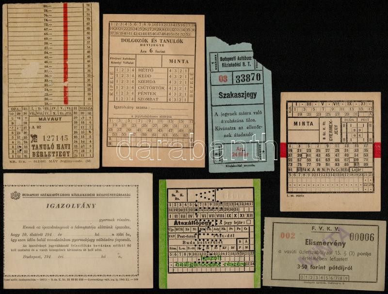 Beschreibung: Budapesti közlekedési jegyek (Budapesti Autóbusz Közlekedési Rt., FVKV, MÁVAUT, Budapest Székesfővárosi Közlekedési Részvénytársaság), 7 db