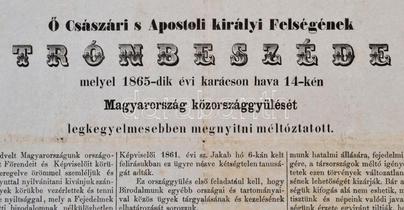 1865 Ő Császár s Apostoli királyi Felségének trónbeszéde melyel 1865-dik évi karácson hava 14-kén Magyarország közországgyülését legkegyelmesebben megnyitni méltóztatott, hajtásnyomokkal, szakadással, 45x30 cm.