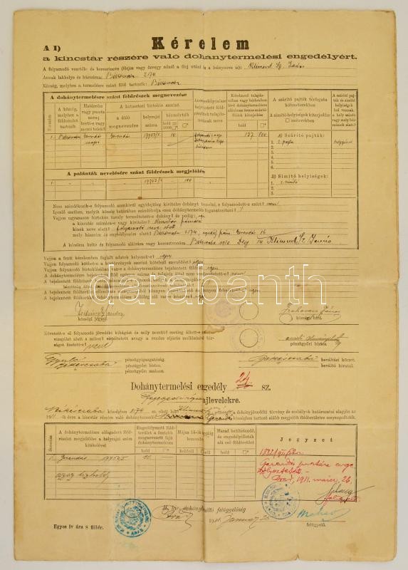 Beschreibung: 1911 Kérelem a kincstár részére való dohánytermelési engedélyért, pecsétekkel, 50x34,5 cm