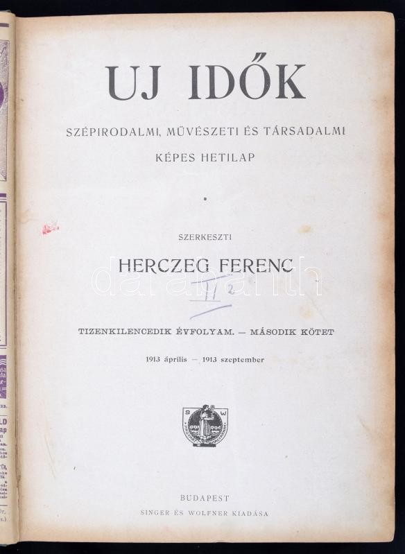 1913 Az Új idők c. folyóirat II. kötet. Szépirodalmi művészeti és társadalmi képes hetilap. Szerkeszti: Herczeg Ferenc. Singer és Wolfner. Kiadói, aranyozott egészvászon-kötésben, viseltes állapotú, hiányos gerinccel.