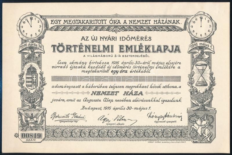 1916 "Egy megtakarított óra a Nemzet Házának", kitöltetlen, díszes igazoló emléklap hadirokkantak segélyezéséről az új nyári időszámítás alkalmából (819. sz.), nyomtatott aláírásokkal, szép állapotban