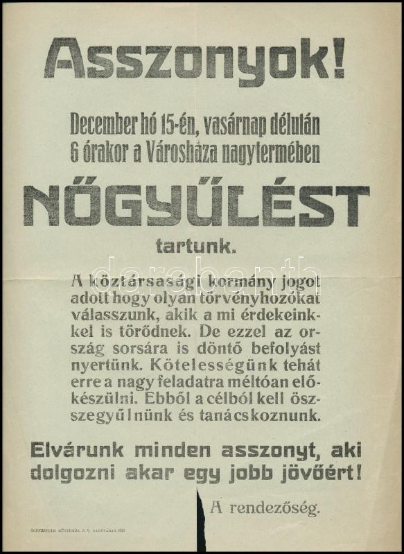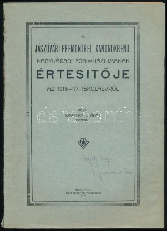 1917-1918 2 db Nagyváraddal kapcsolatos nyomtatvány: 1917 A jászóvári premontrei kanonokrend nagyváradi főgimnáziumának értesítője az 1916-1917. iskolaévről. Közli: Szmetka L. Ödön. Nagyvárad, 1917, Láng József, 98+2 p. Kiadói papírkötés, foltos, sérült gerinccel. 1918 Asszonyok nőgyűlést tartunk! Nagyvárad, Sonnenfeld Műnyomda Rt.-ny., röplap, kissé szakadt.
