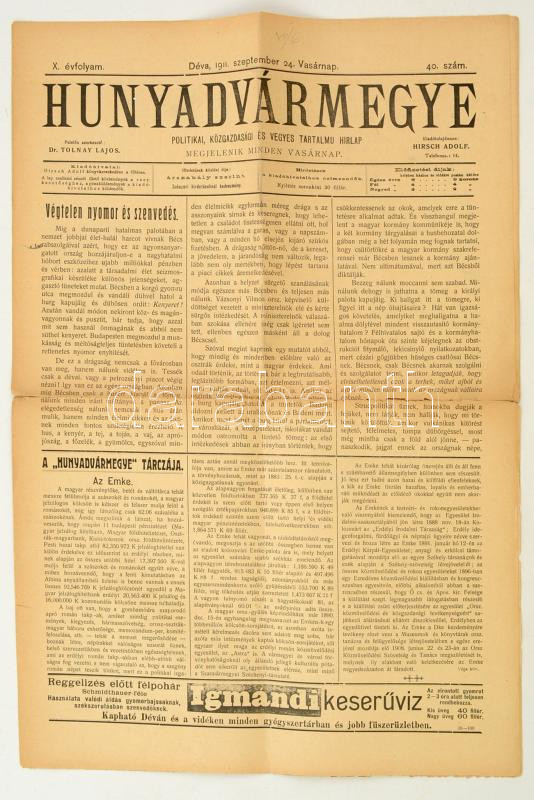 Beschreibung: Hunyadvármegye, X. évf. 40. szám, 1911. szeptember 24., Szerk.: Dr. Tolnay Lajos, Déva, Hirsch Adolf, kissé szakadozott, viseltes állapotban.