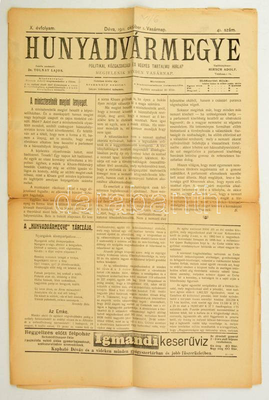 Hunyadvármegye, X. évf. 41. szám, 1911. október 1., Szerk.: Dr. Tolnay... https://www.darabanth.com/de/319-Fernauktion/319.0/Andere-Sammelgebiete/Drucksachen~28/Hunyadvarmegye-X-evf-41-szam-1911-oktober-1-Szerk-Dr-Tolnay-Lajos-Deva-Hirsch-Adol~II1469426
